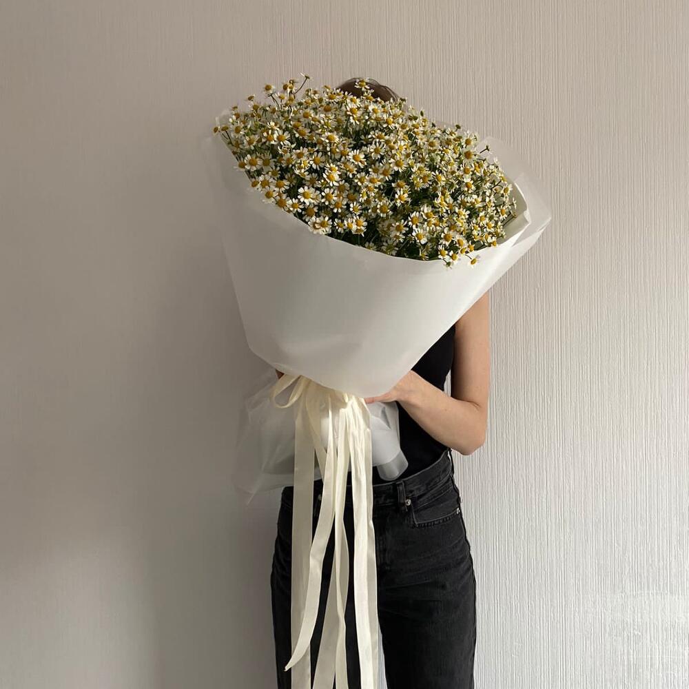 Солнце в руках, букет с ранункулюсами, ромашками и пионовидными розами
