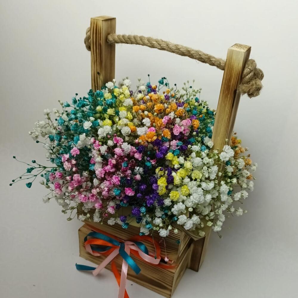 Позитивная разноцветная гипсофила в натуральном ящике вызовет радость и море улыбок