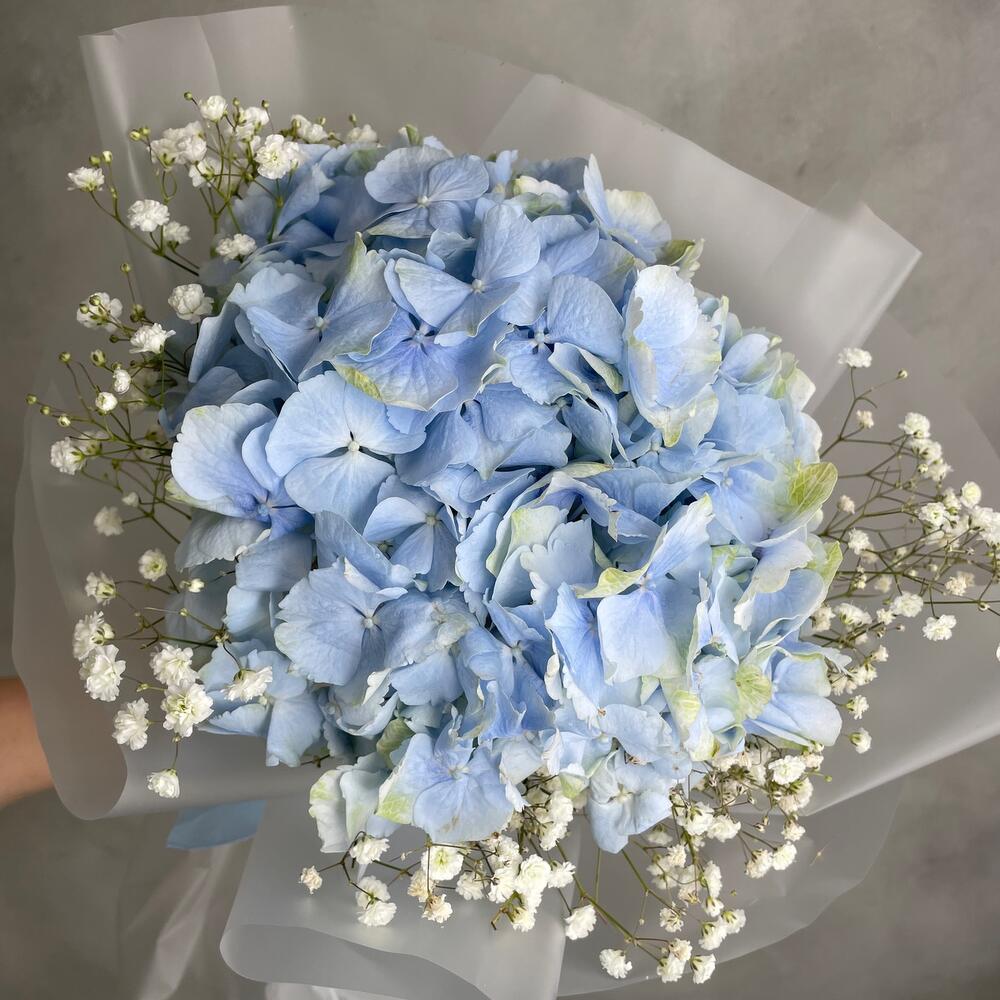 Гортензия верена блю – 1 шт.Гипсофила – 2 шт.Упаковка дизайнерская – 1 шт.