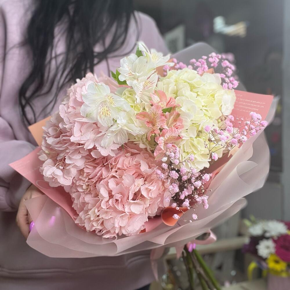 Гипсофила – 1 шт.Гортензия – 3 шт.Упаковка дизайнерская – 1 шт.Альстромерия Микс Европа – 2 шт.