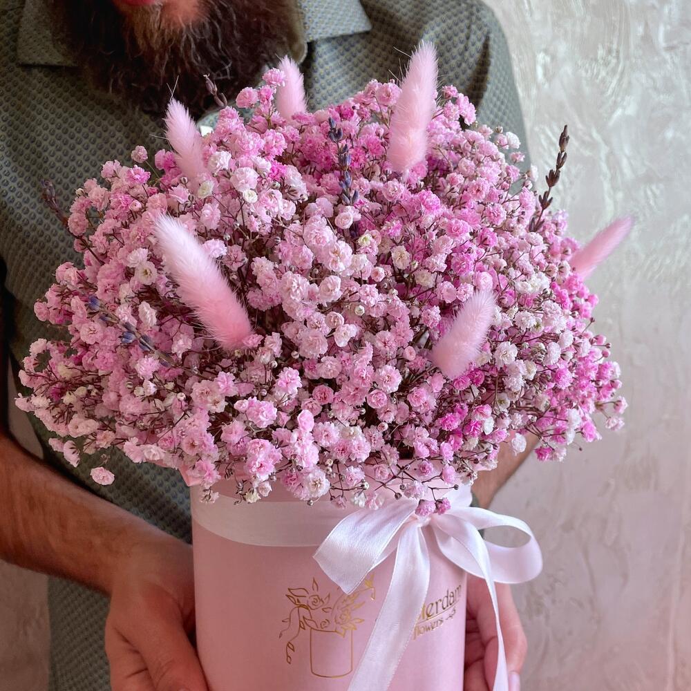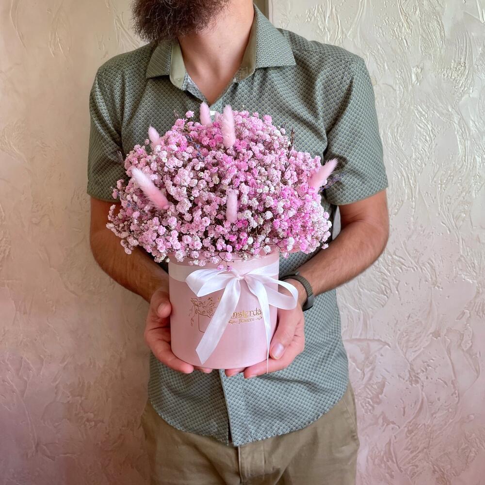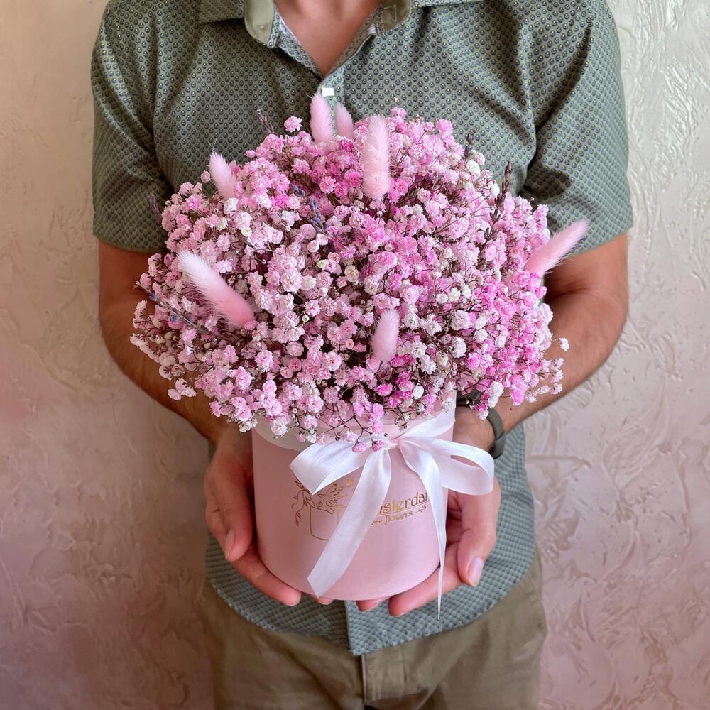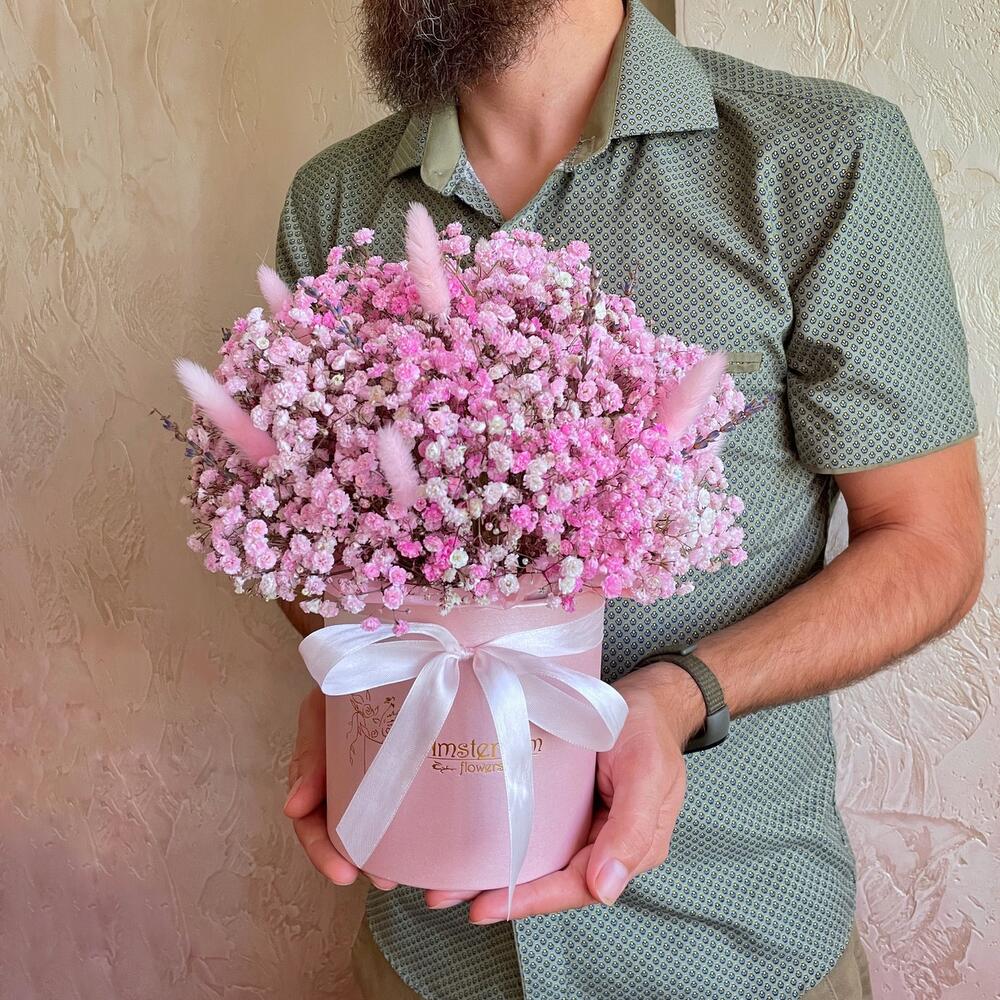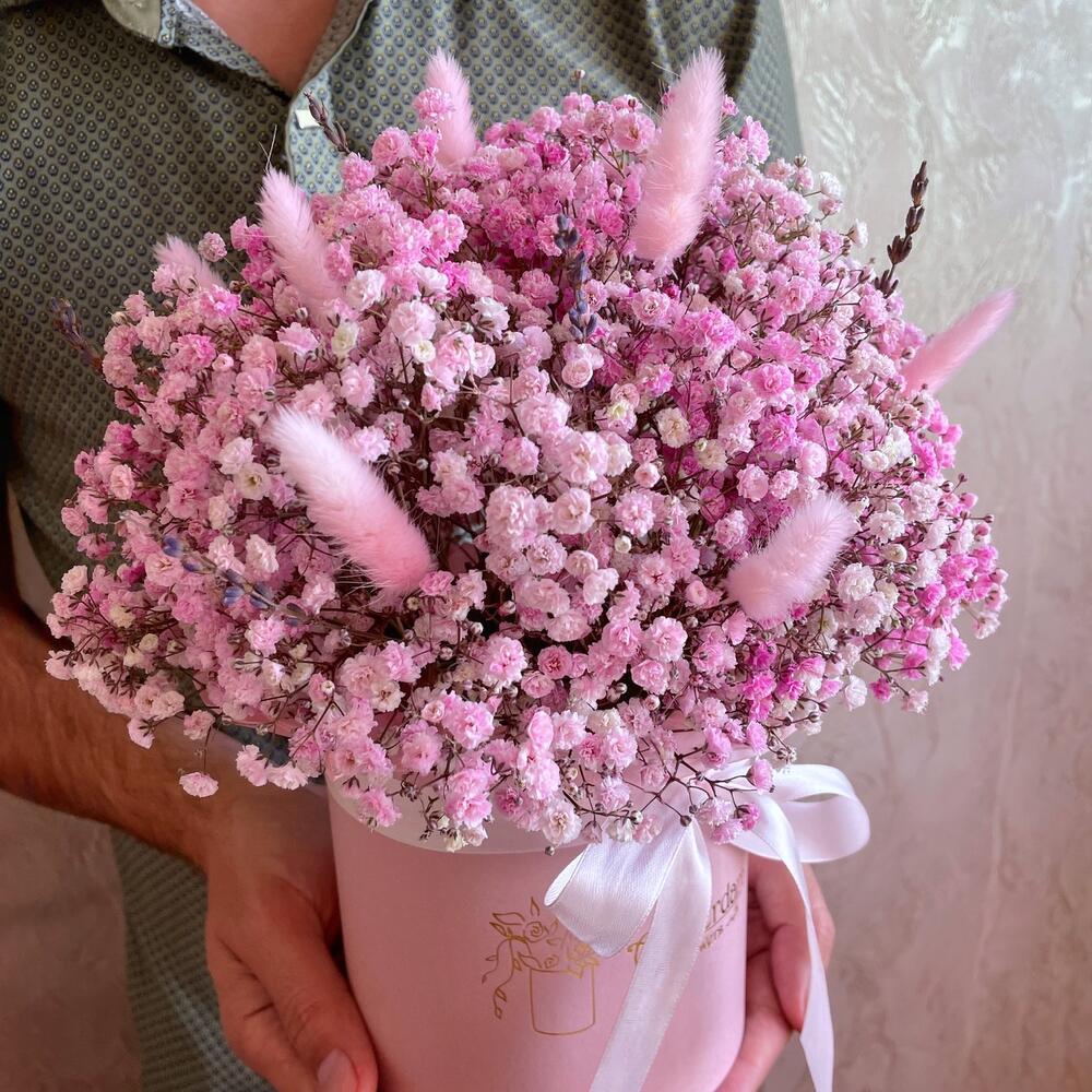 Нежная стойкая композиция из розовой гипсофилы с сухоцветами. Для самых взыскательных особ.