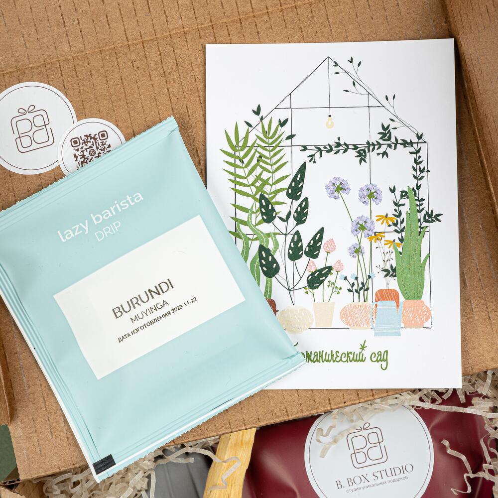 маска в колбе laboratorium – 1 шт.мыло laboratorium – 1 шт.подставка-ладошка для благовоний из гипсофила – 1 шт.благовоние пало санто – 1 шт.ароматная соль для ванной bbox.studio – 1 шт.носочки универсального размера – 1 шт.дрип-кофе – 1 шт.