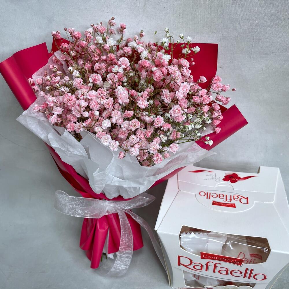raffaello 150 гр – 1 шт.Гипсофила – 3 шт.Упаковка – 1 шт.Пакет крафт – 1 шт.