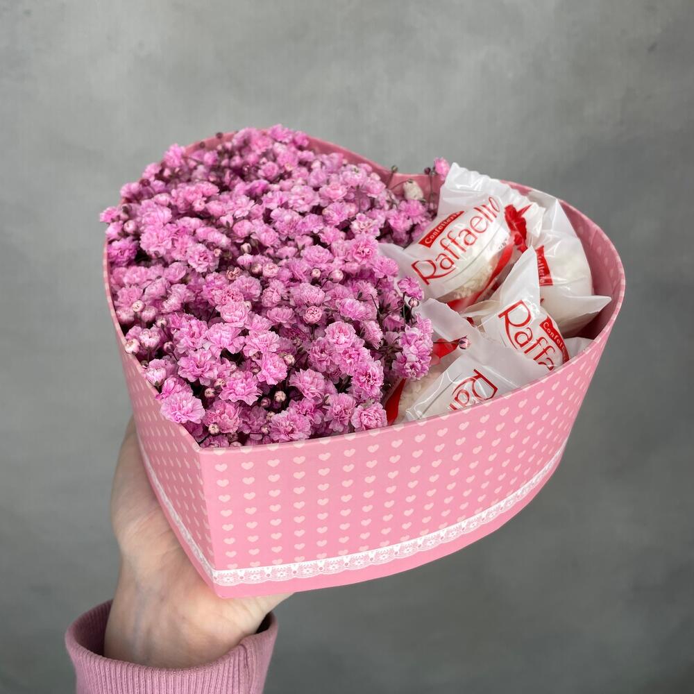 “Сладкое сердце ” – цветочная композиция с сладостями в коробке “Сердце”