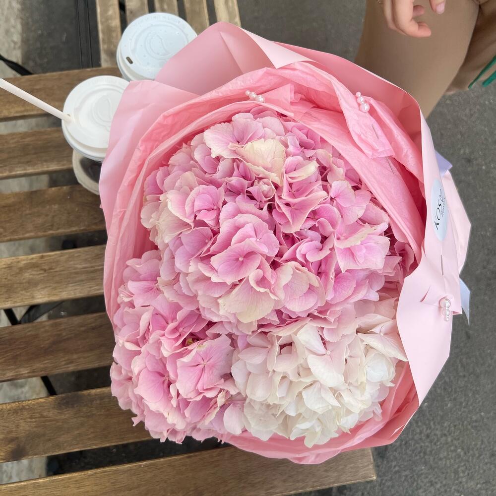 Гортензия розовая – 3 шт.Упаковка дизайнерская – 3 шт.Тишью – 2 шт.