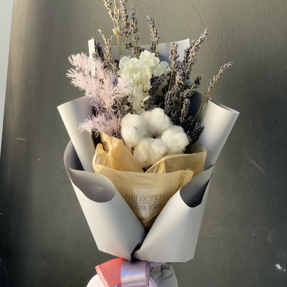 Хлопок – 1 шт.Аспарагус – 1 шт.Стабилизированная гортензия – 1 шт.
