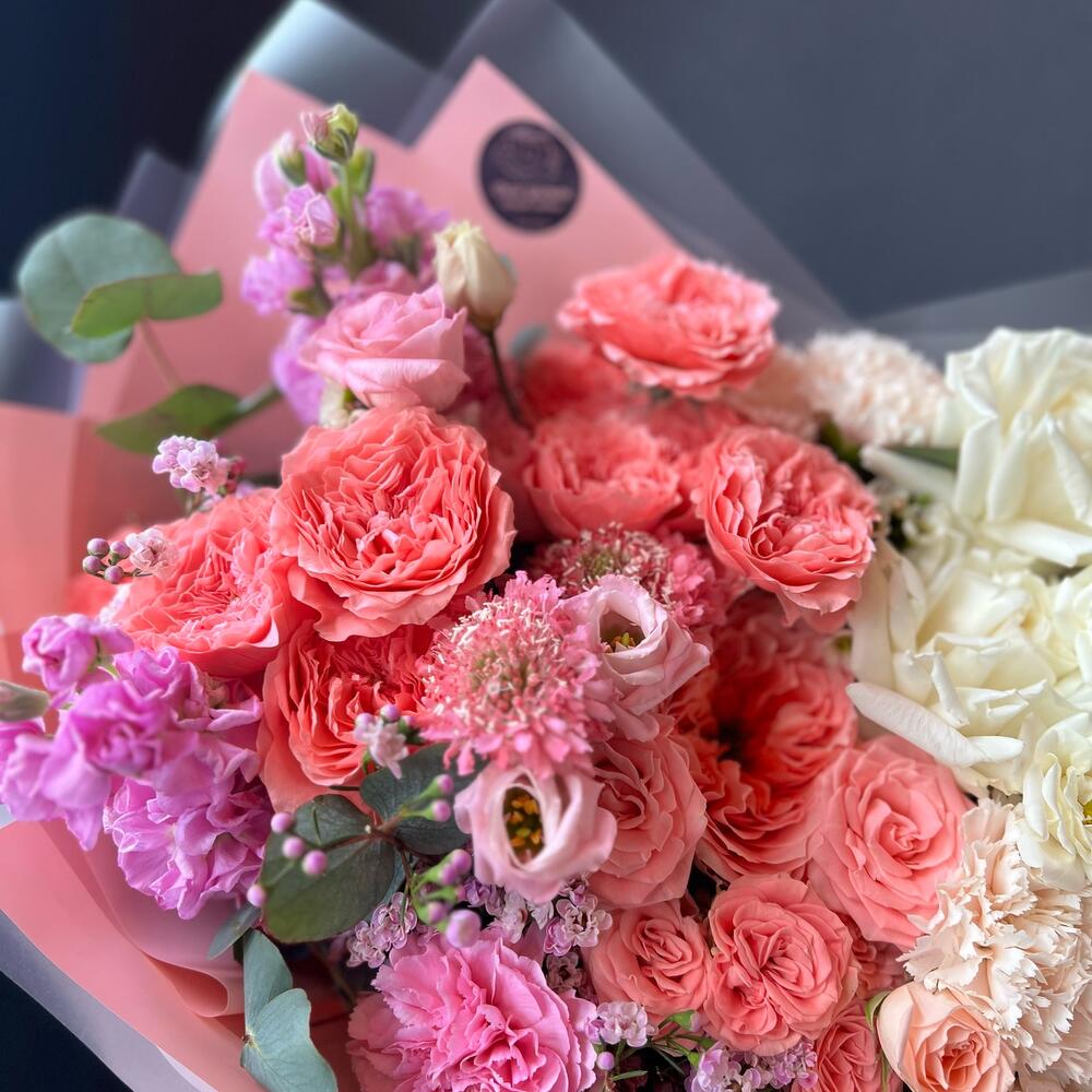 Альстромерия – 1 шт.Лизиантус – 2 шт.Маттиола – 2 шт.Роза кустовая – 6 шт.Скабиоза – 2 шт.Эвкалипт – 2 шт.Роза – 3 шт.Гвоздика – 3 шт.Роза пионовидная – 1 шт.Хамелациум – 2 шт.Атласная лента – 1 шт.декоративная упаковка – 1 шт.