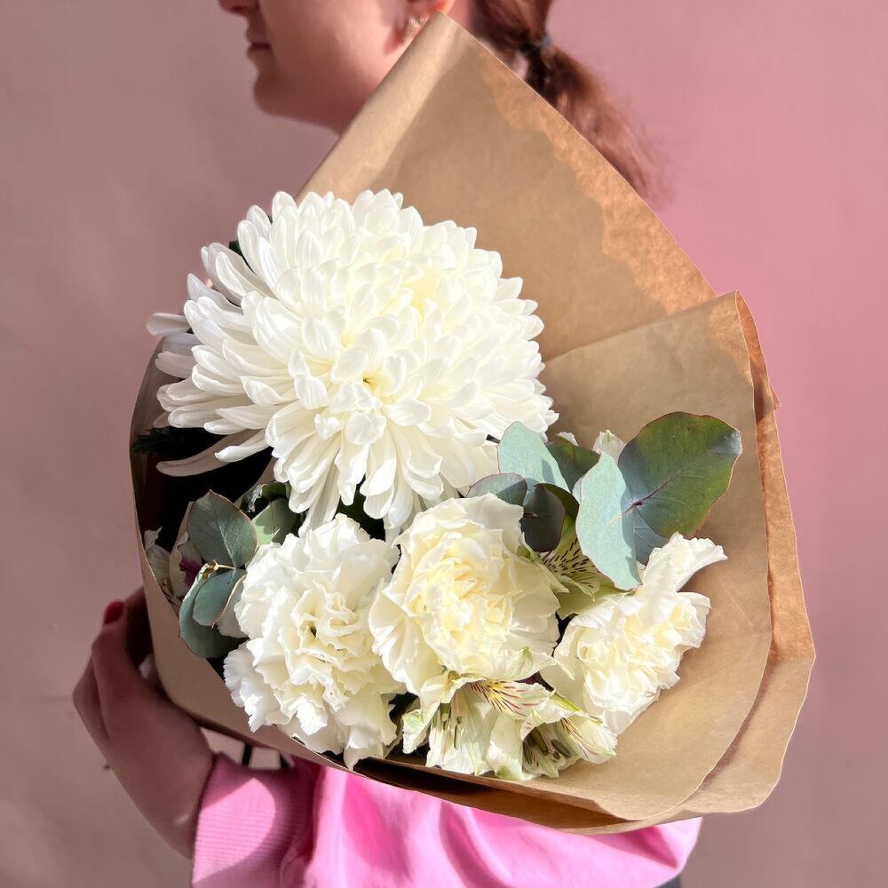 Альстромерия – 2 шт.Эвкалипт – 1 шт.Лента атласная – 1 шт.Диантус – 3 шт.Крафт – 1 шт.Хризантема Антонов – 1 шт.