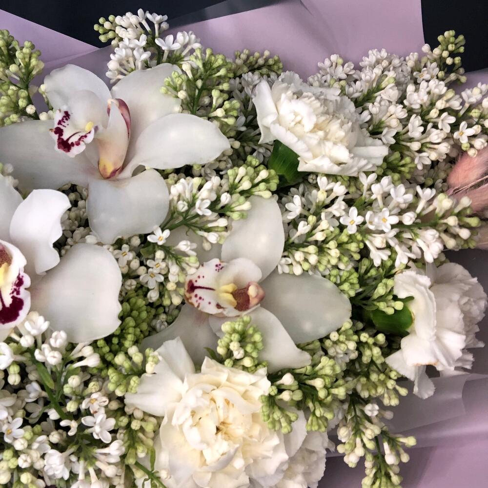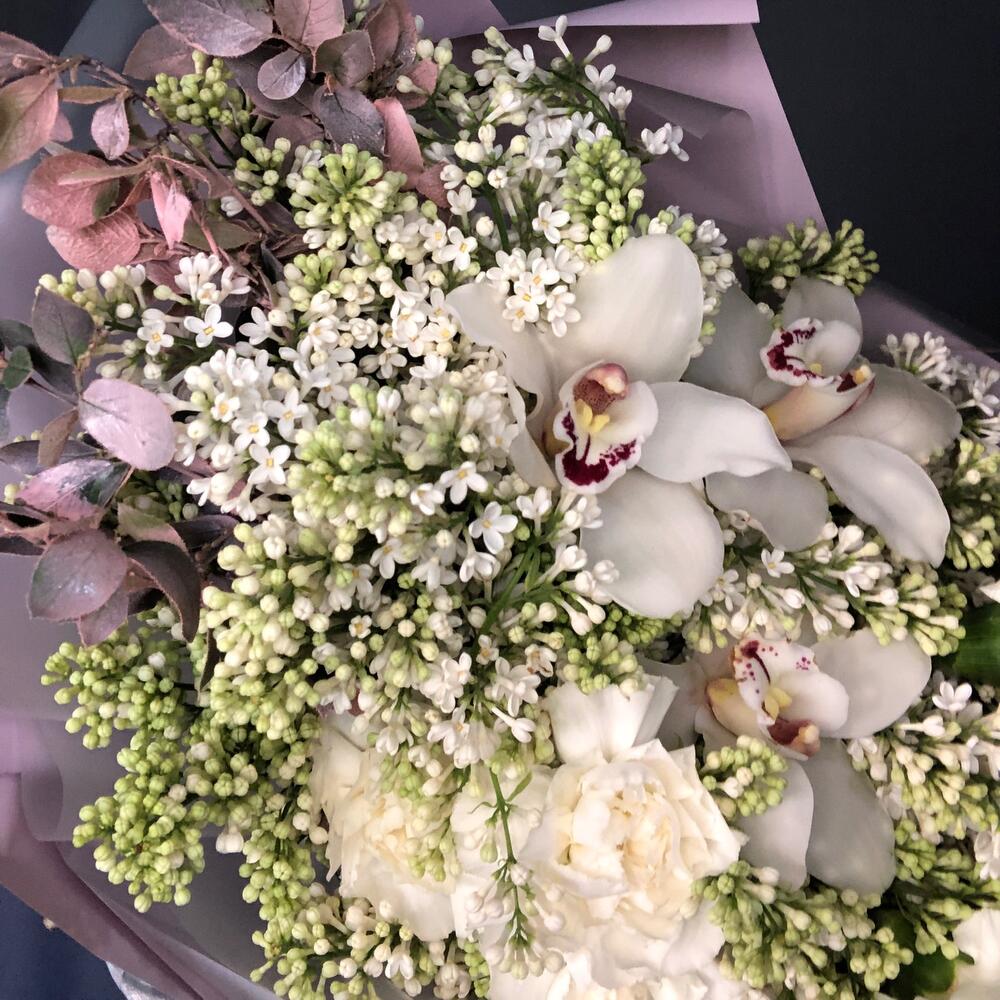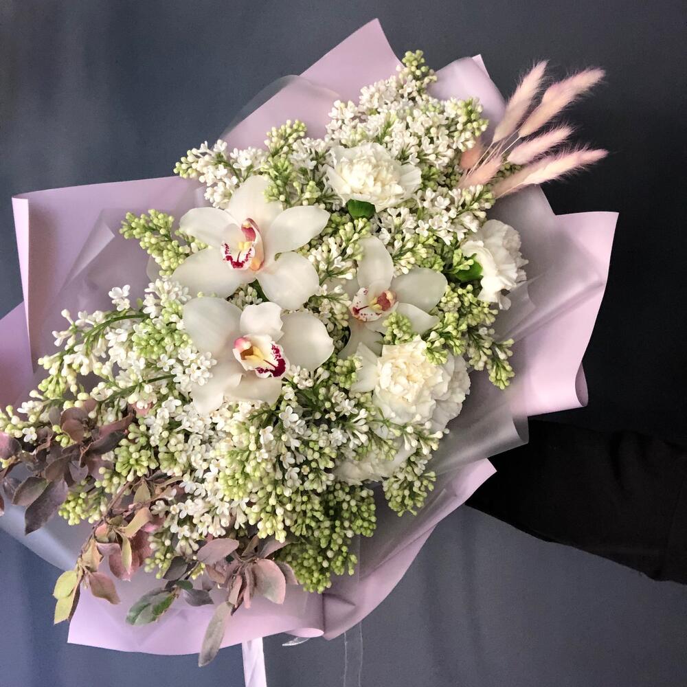 сирень пучок – 5 шт.Цимбидиум белый – 3 шт.гвоздика сортовая (диантус) – 5 шт.лагурус пучок – 1 шт.ветки декоративные – 1 шт.Упаковка дизайнерская – 2 шт.Лента атласная – 1 шт.
