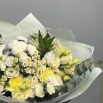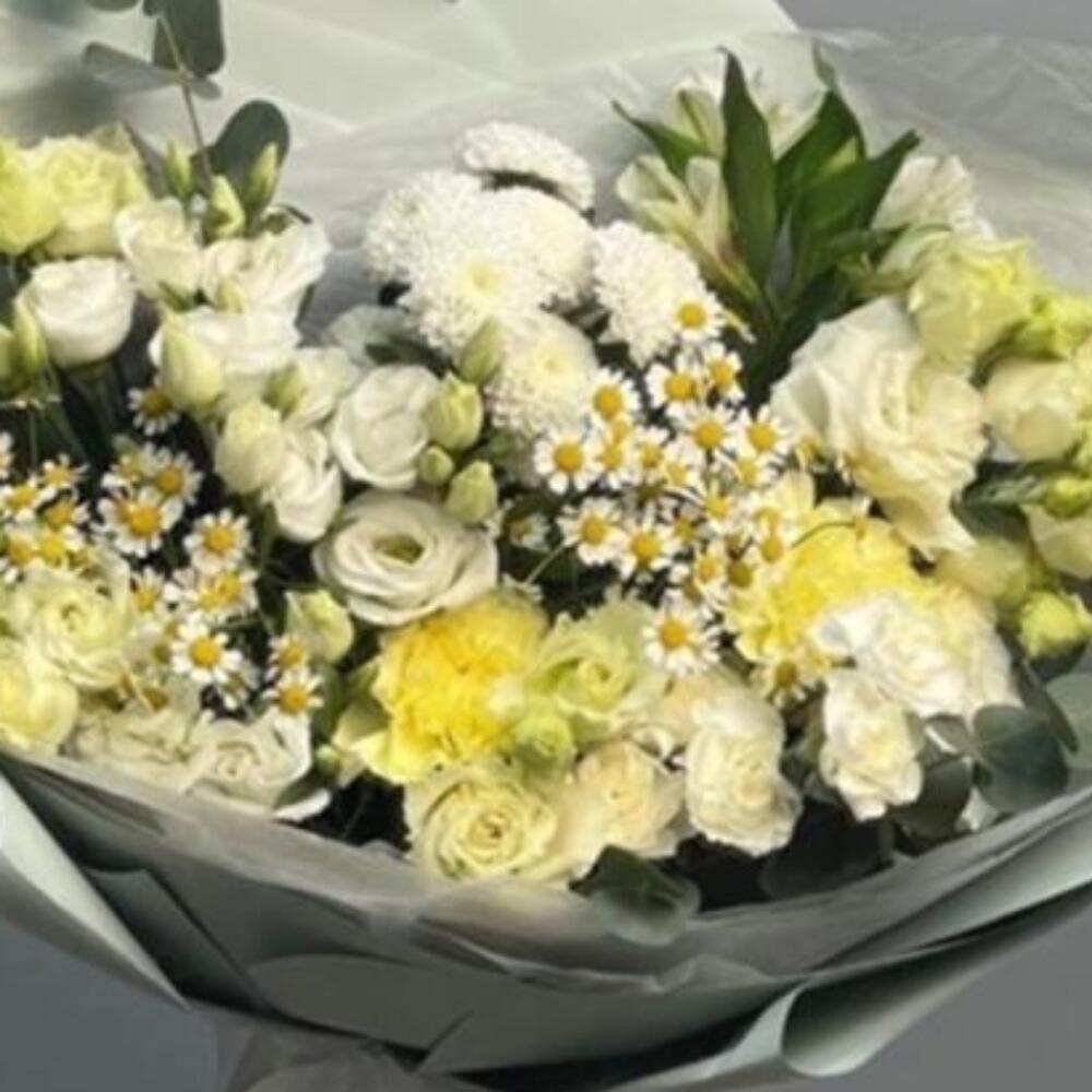 Альстромерия – 2 шт.Лизиантус – 5 шт.Хризантема Сантини – 3 шт.Гвоздика – 3 шт.Матрикария – 3 шт.Упаковка дизайнерская – 1 шт.