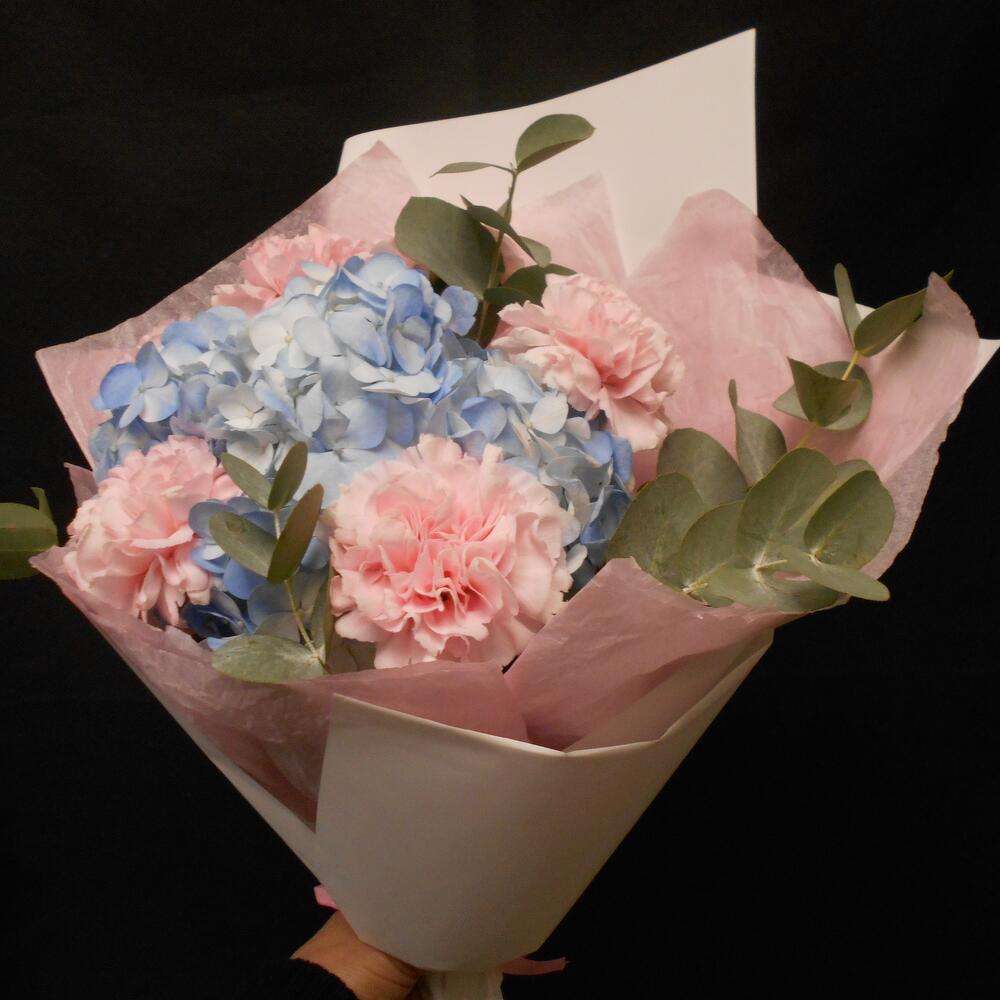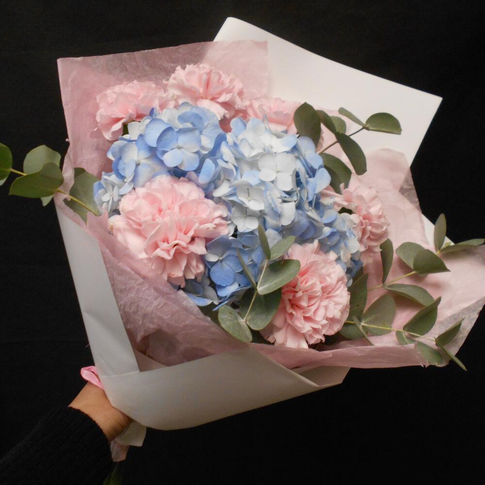 Гортензия голубая с гвоздиками и эвкалиптом