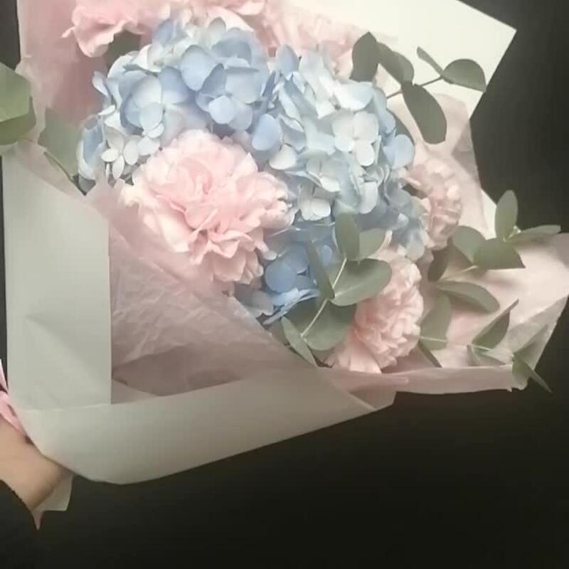 Лента атласная – 3 шт.Гортензия голубая – 1 шт.бумага тишью розовая – 3 шт.пленка матовая белая – 4 шт.гвоздики одноголовые розовые – 6 шт.ветви эвкалипта сухоцвет – 5 шт.