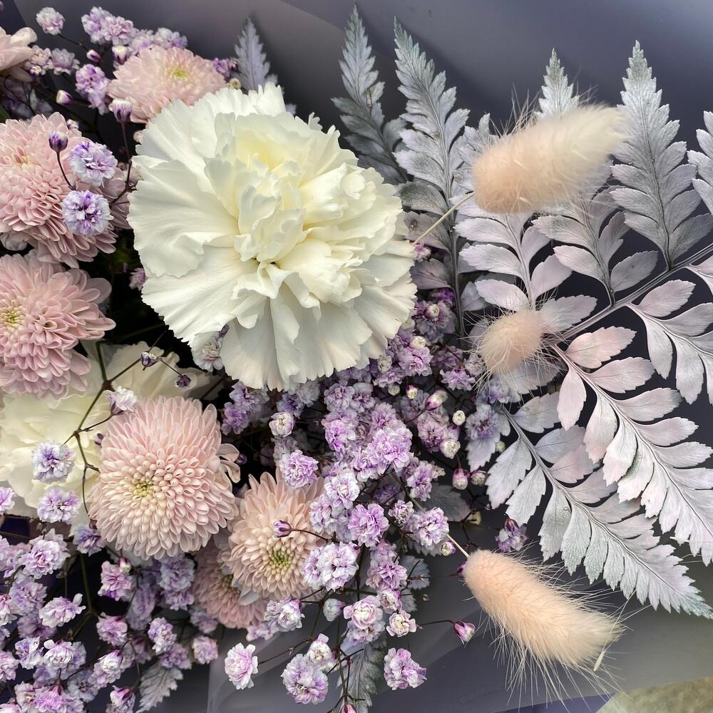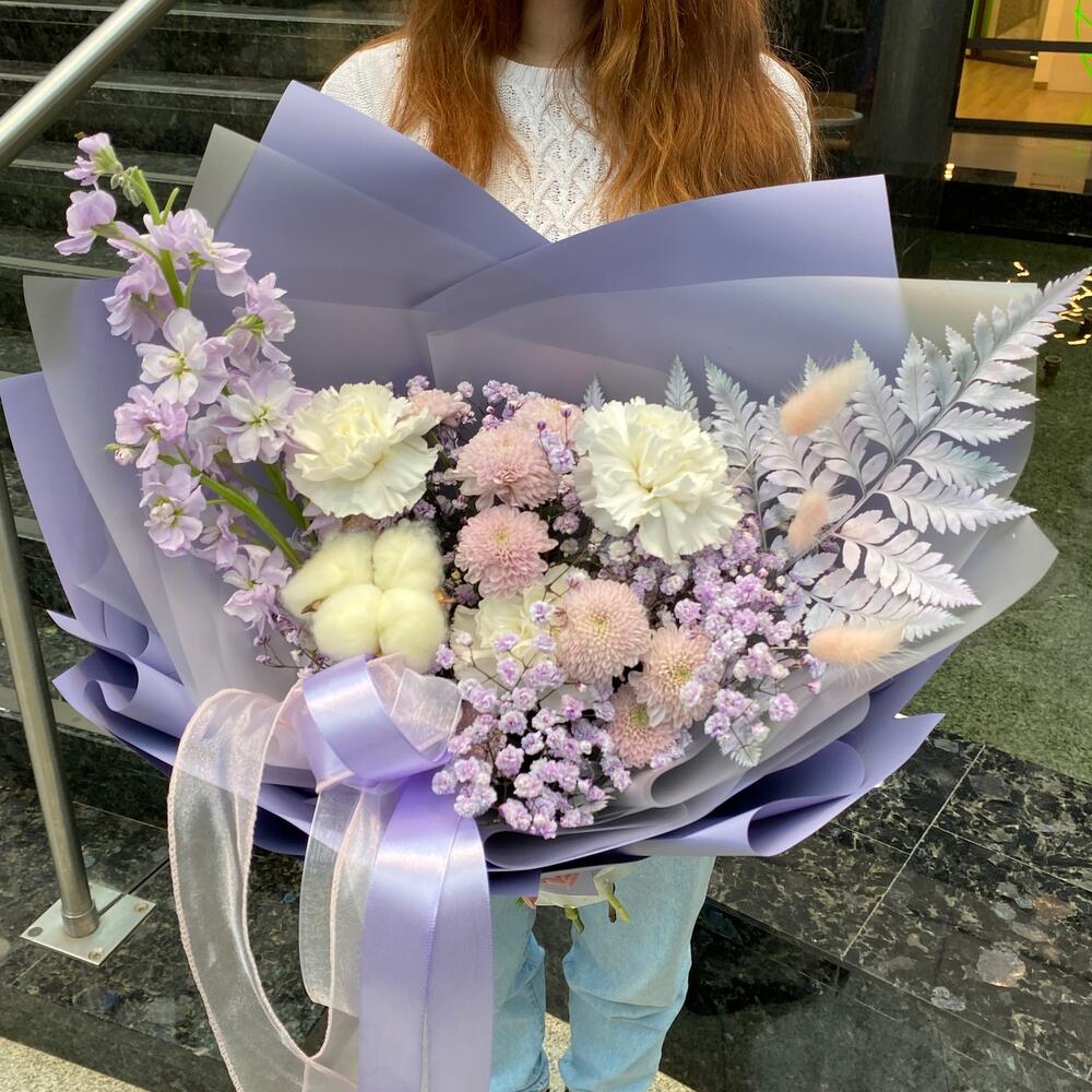 Хлопок – 1 шт.Гвоздика – 3 шт.Сантини – 2 шт.Маттиола – 1 шт.Папоротник – 1 шт.Гипсофила – 1 шт.