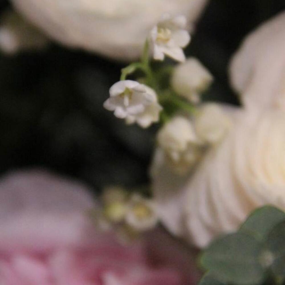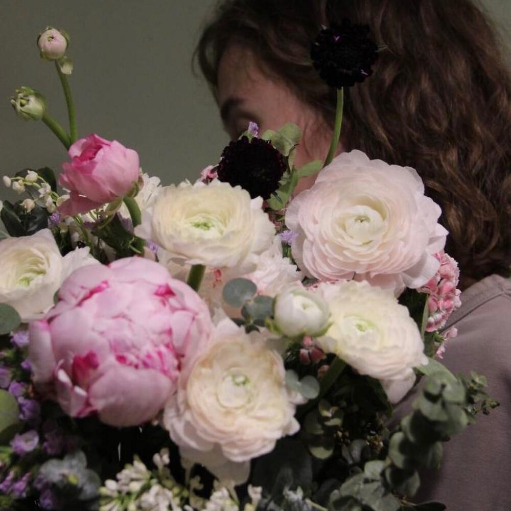 Пион – 5 шт.Сирень – 1 шт.Ранункулюс – 7 шт.Тюльпан – 1 шт.Ландыш – 5 шт.Статица – 2 шт.Скабиоза – 3 шт.Диантус – 5 шт.Эвкалипт – 10 шт.Лукошко плетеное – 1 шт.Оазис флористический – 1 шт.