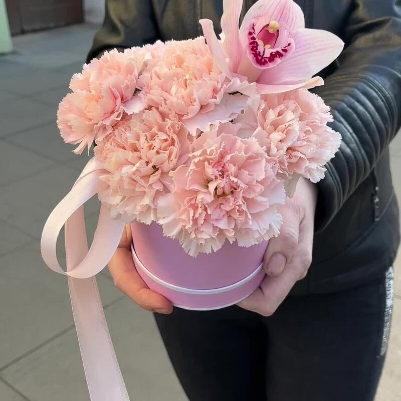 Орхидея Цимбидиум белая – 1 шт.Диантус кремовый – 7 шт.Оазис флористический – 1 шт.удлинитель для орхидеи – 1 шт.Лента атласная нежно-розовая – 1 шт.шляпная коробочка мини – 1 шт.