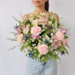 Альстромерия – 6 шт.Кампанула – 10 шт.Тласпи – 1 шт.Эрингиум – 4 шт.Гвоздика розовая – 9 шт.Ромашка кустовая – 15 шт.Фисташка – 8 шт.амбрелла – 3 шт.