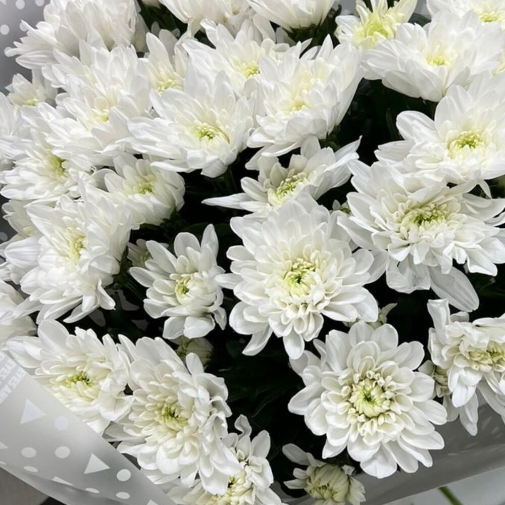 Упаковка – 2 шт.Лента атласная – 1 шт.Хризантема кустовая белая – 9 шт.