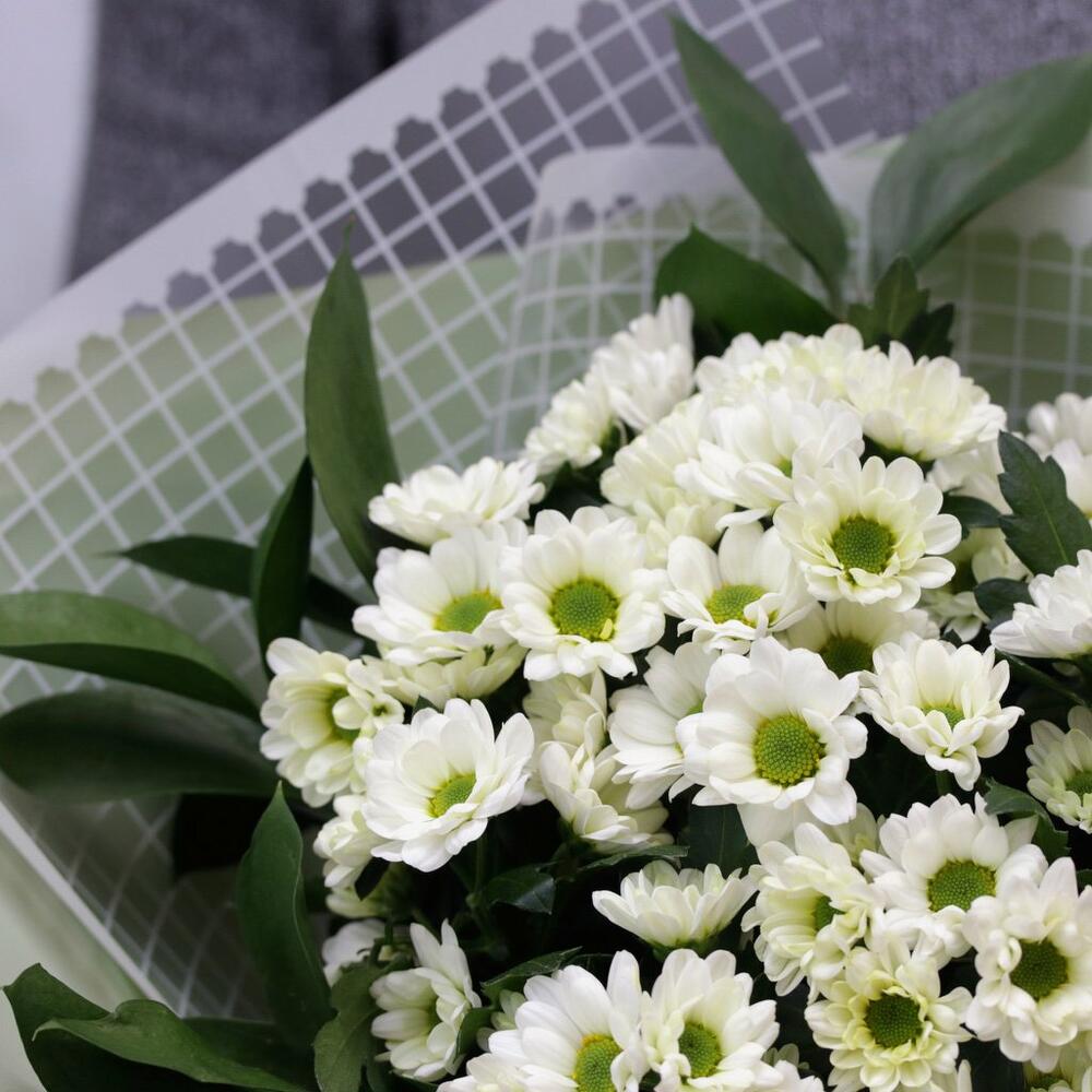 Букет из 11 белых кустовых хризантем Сантини с зеленью