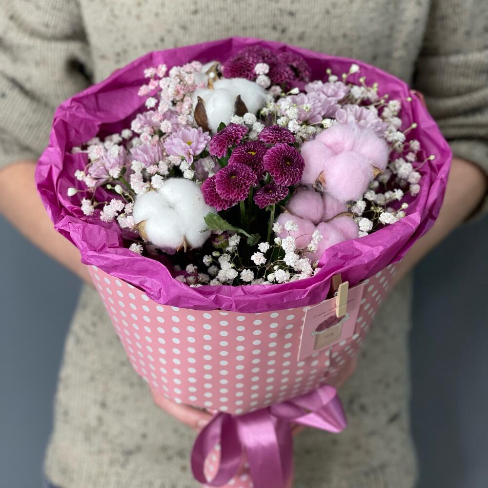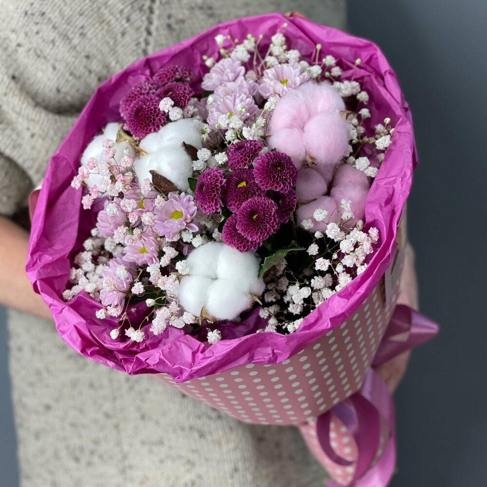 Гипсофила – 2 шт.Хлопок – 5 шт.Хризантема Сантини – 4 шт.Лента атласная – 1 шт.Упаковка дизайнерская – 1 шт.Открыточка с вашими пожеланиями – 1 шт.
