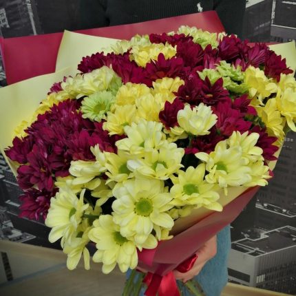 Хризантема кустовая – 7 шт.Ирис – 13 шт.Упаковка дизайнерская – 1 шт.