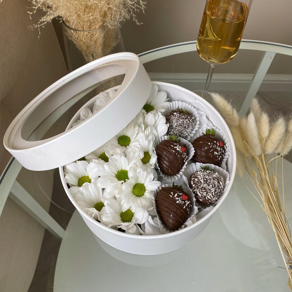 Милейший подарочный набор в круглой коробке с прозрачной крышкой хризантемы и клубники в молочном шоколаде, идеальный подарок, который никого не оставит равнодушным!Срок хранения клубники 24 часа при температуре от +2 до +8