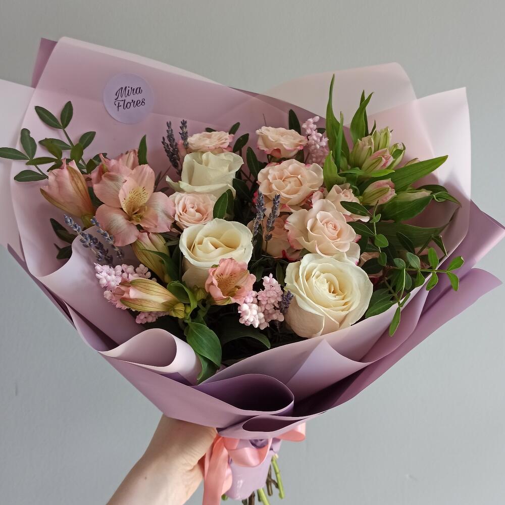 Букет из кустовых роз, роз, альстромерии, лаванды и сорго