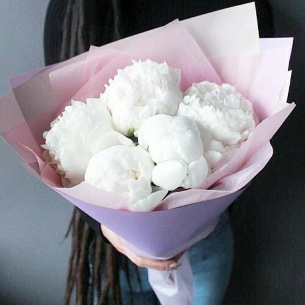 Пион белый – 5 шт.Упаковка дизайнерская – 1 шт.Лента атласная – 1 шт.