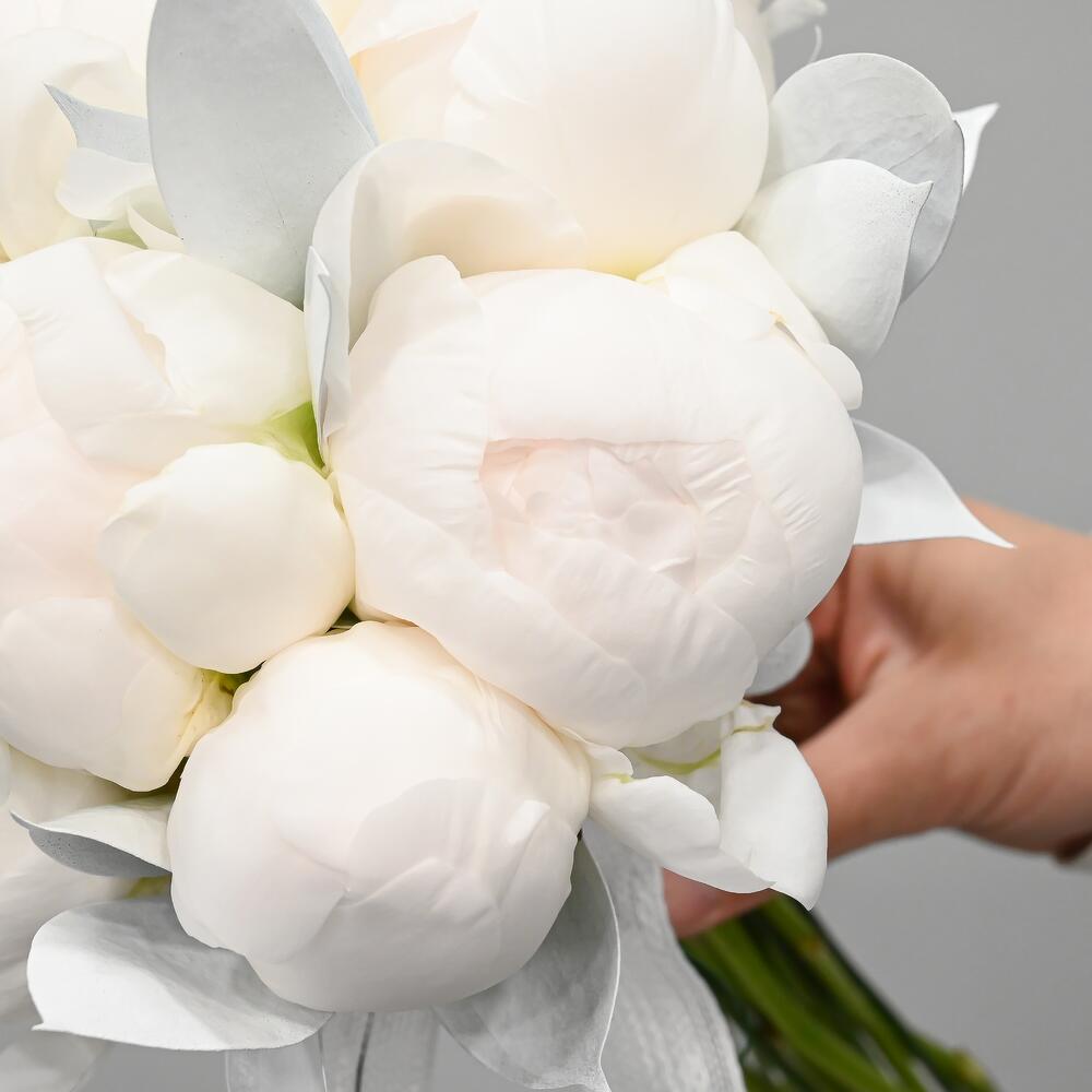 Элегантный свадебный букет в белой цветовой гамме из 9 пионов перевязанных декоративной лентой.Флористы студии Цветочный Этикет собрали его из самых свежих цветов. Букет готов сиять красотой на всех фотография.