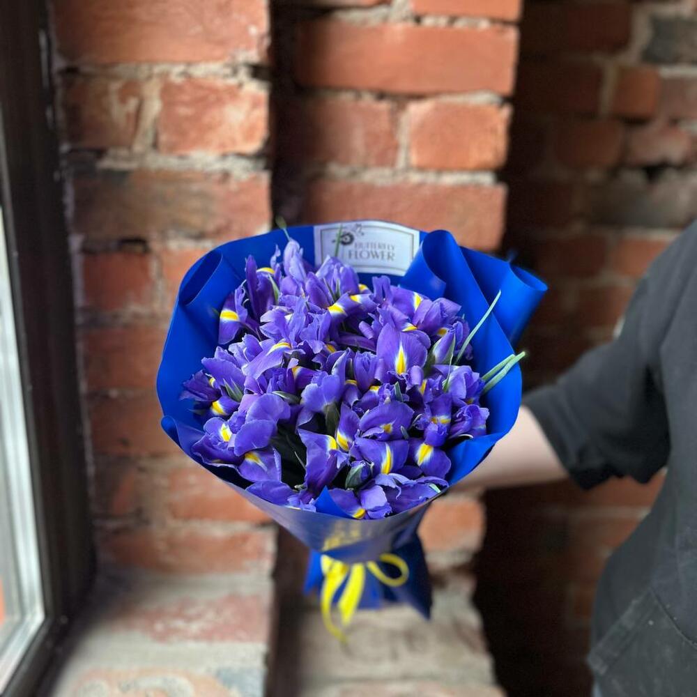 ирисы синие – 9 шт.Кустовая ромашка – 6 шт.Упаковка матовая – 1 шт.Атласная лента – 1 шт.