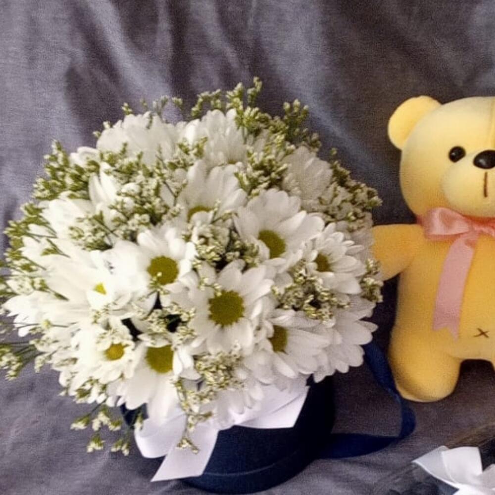 Лимониум – 35 шт.Лента атласная – 1 шт.Шляпная коробка – 1 шт.Голубика – 125 гр.Пакет подарочный – 1 шт.Мишка плюшевый – 1 шт.Флористическая губка – 1 шт.ромашки – 25 шт.