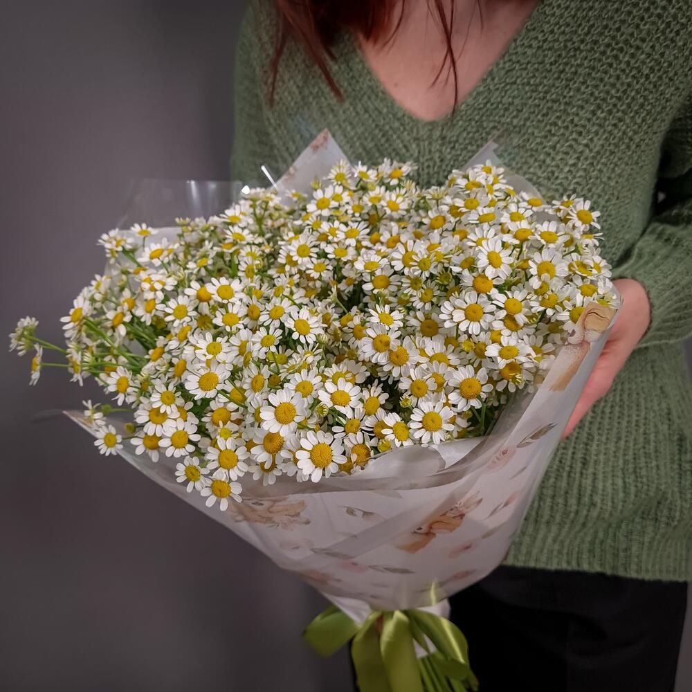 Ромашка кустовая – 21 шт.Упаковка дизайнерская – 1 шт.Аквапак – 1 шт.Средство для продления жизни цветов – 2 шт.