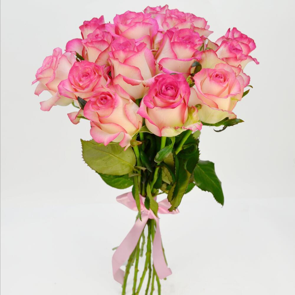 Круглый букет из 15 бело-розовых роз перевязанных атласной лентой. Нежный букет, которому будет рада как молодая девушка, так и женщина в любом возрасте 🙂