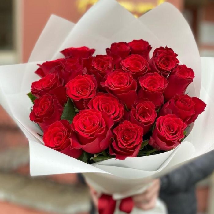 Роза красная – 21 шт. Открыточка с вашими пожеланиями – 1 шт. Упаковка дизайнерская – 1 шт. инструкция по уходу за цветами – 1 шт.