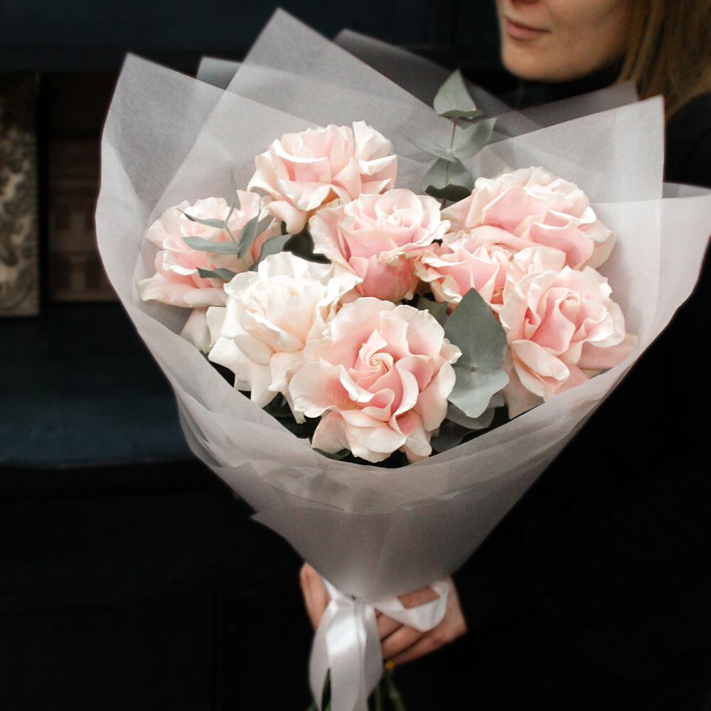 Эвкалипт – 2 шт.Тишью – 2 шт.Атласная лента – 2 шт.Французская роза – 9 шт.Матовая пленка – 2 шт.