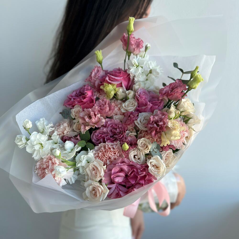 Маттиола – 3 шт.Эвкалипт – 1 шт.Кустовая роза – 7 шт.Гвоздика – 7 шт.Эустома – 2 шт.Пионовидная роза – 5 шт.