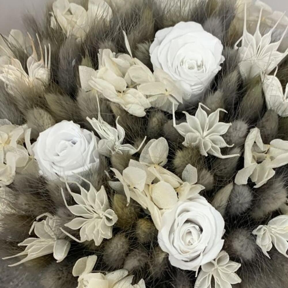 Кашпо керамическое – 1 шт.Роза стабилизированная – 3 шт.гортензия стабилизированная – 1 шт.лагурус пучок – 2 шт.Нигелла сухоцвет – 15 шт.