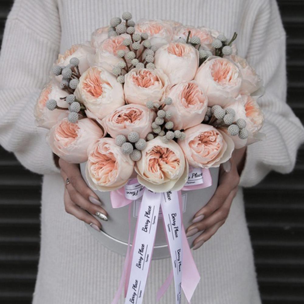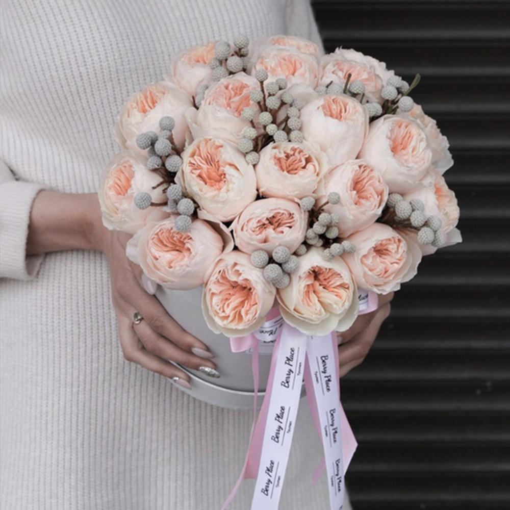 Роза пионовидная – 19 шт.Бруния – 10 шт.Лента – 2 шт.Коробка – 1 шт.