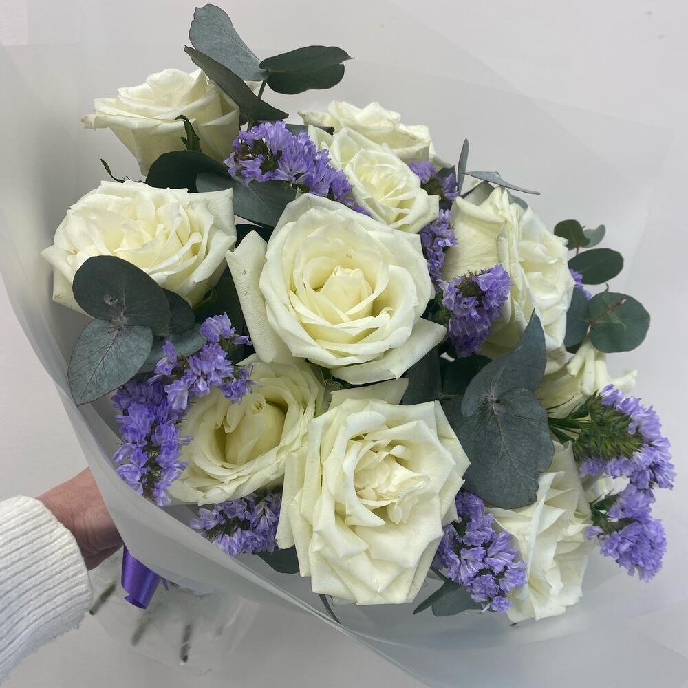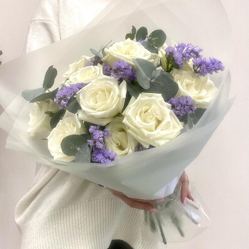 Роза – 11 шт.Статица – 2 шт.Эвкалипт – 3 шт.Упаковка – 1 шт.Лента – 1 шт.