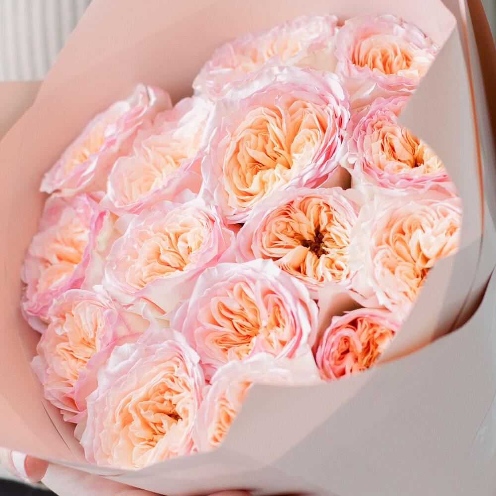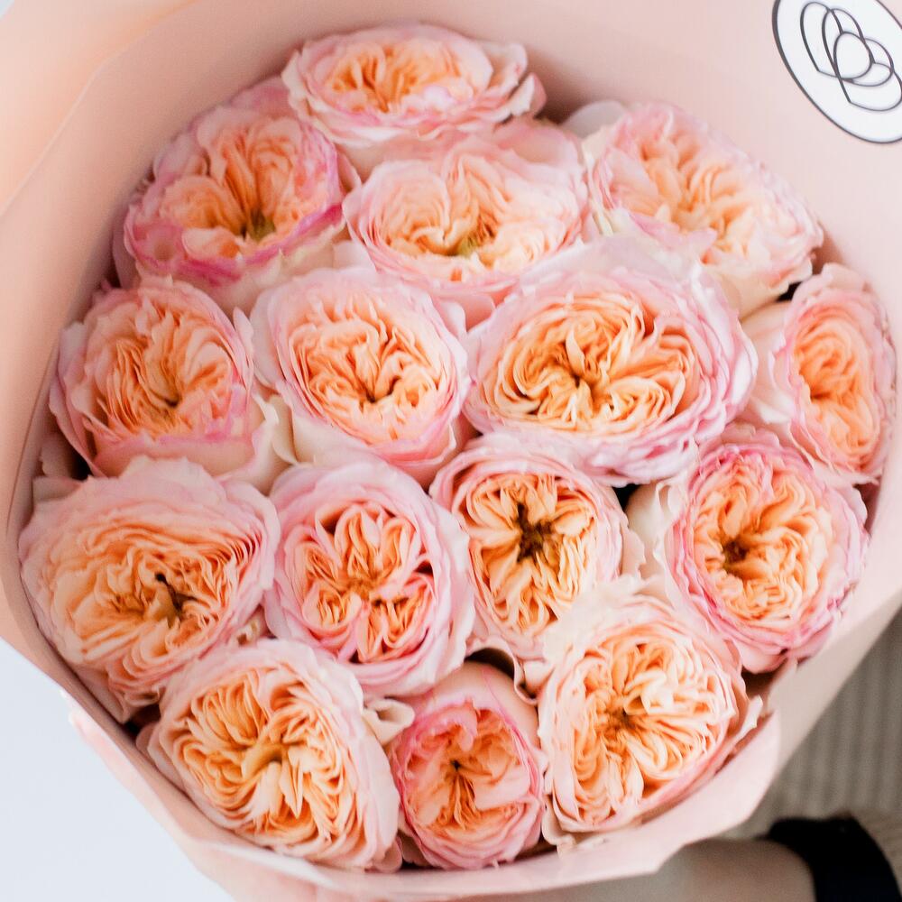 Букет из 15 персиковых пионовидных роз Flash Back 40 см в упаковке