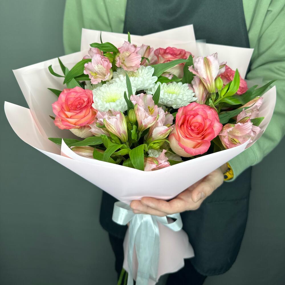 Альстромерия – 3 шт.Хризантема кустовая – 1 шт.Лента атласная – 1 шт.Упаковка дизайнерская – 1 шт.Роза одноголовая эквадор 50 см – 5 шт.