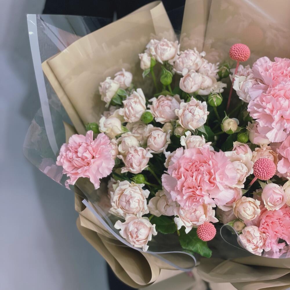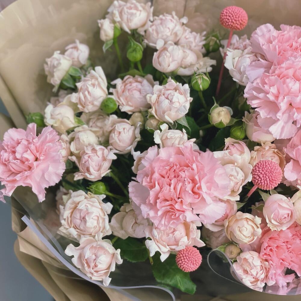 Букет из гвоздик и пионовидных кустовых роз
