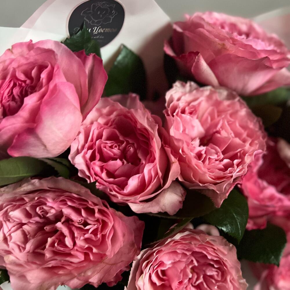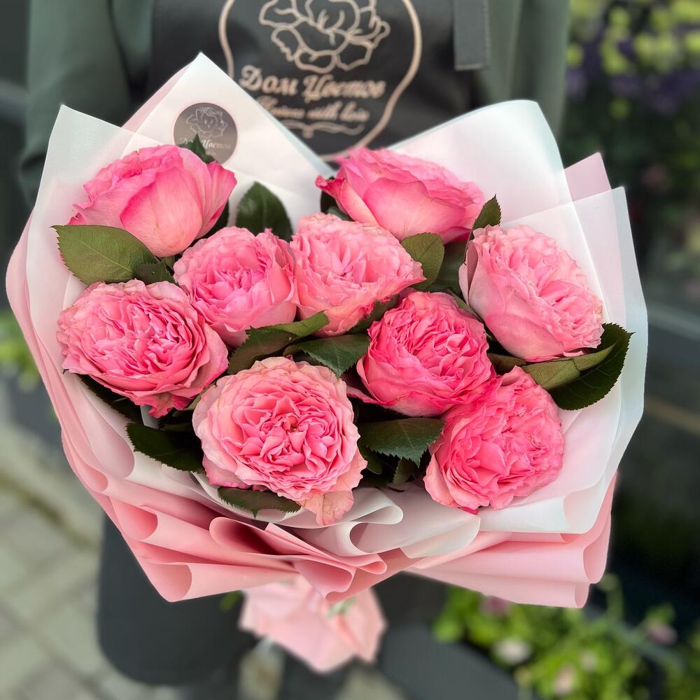 Атласная лента – 1 шт.декоративная упаковка – 1 шт.пионовидная одноголовая роза mayra pink – 9 шт.