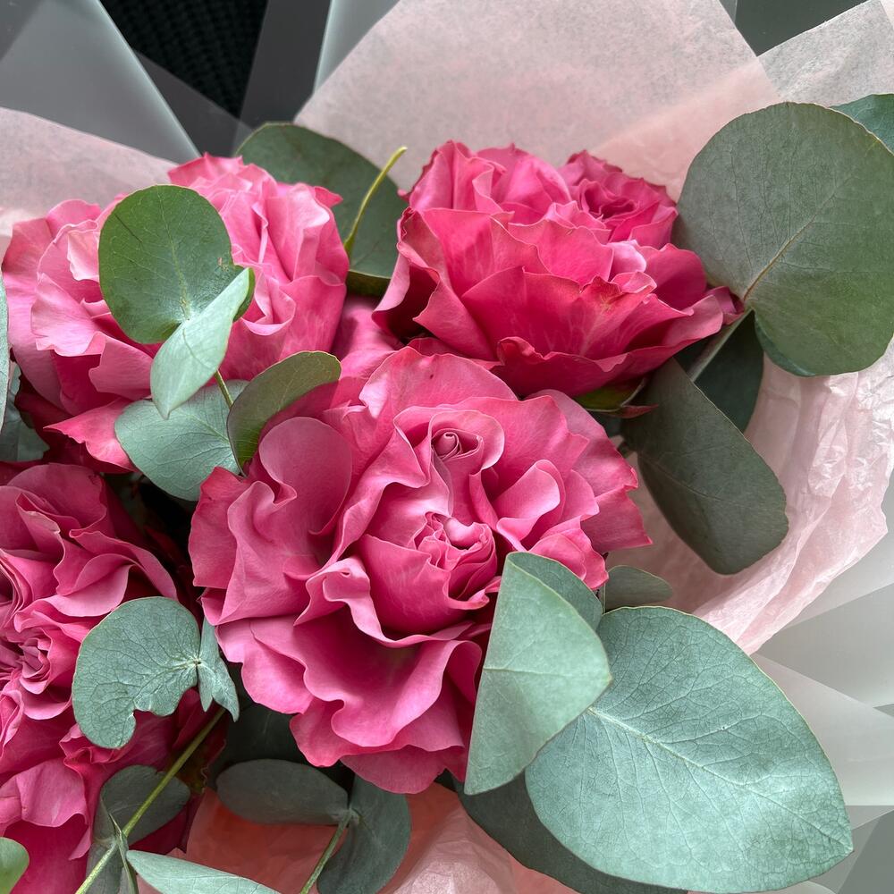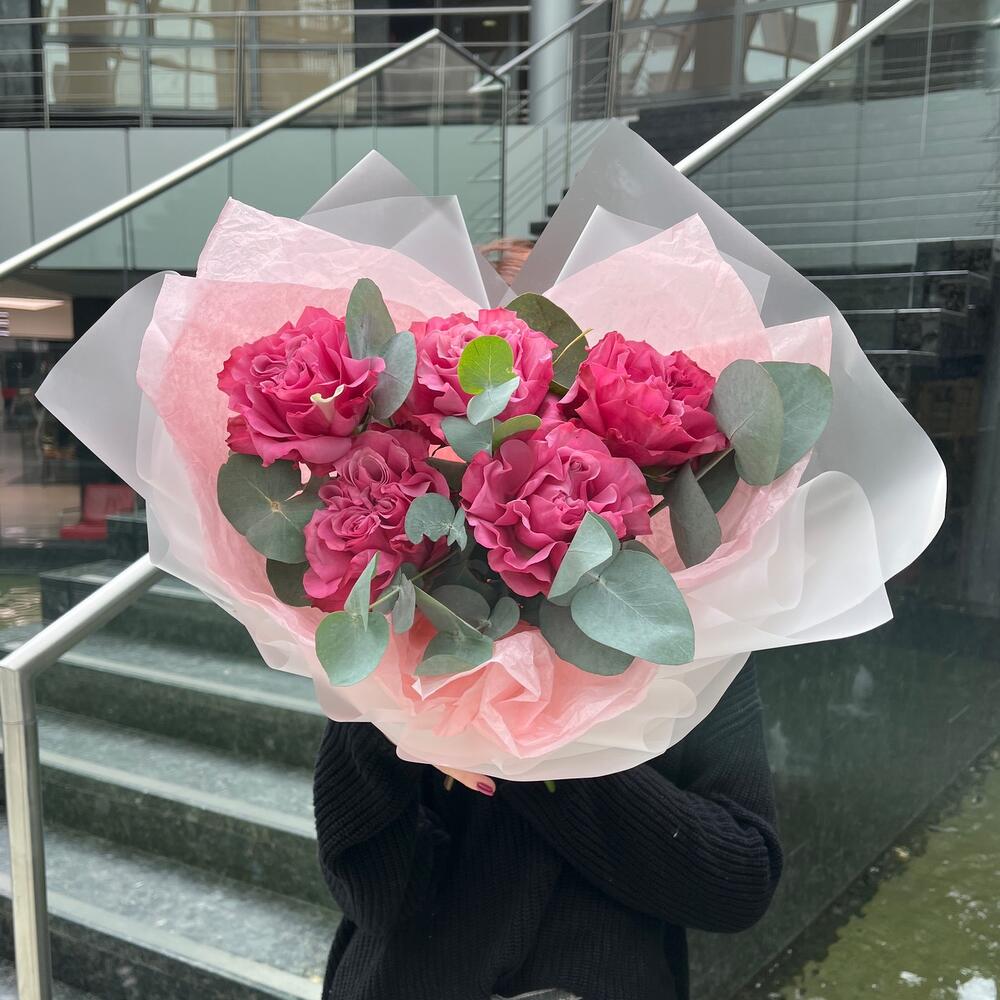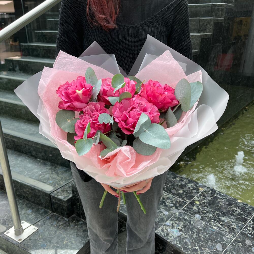 Роза пионовидная – 5 шт.Эвкалипт – 1 шт.Лента – 2 шт.Упаковка дизайнерская – 2 шт.