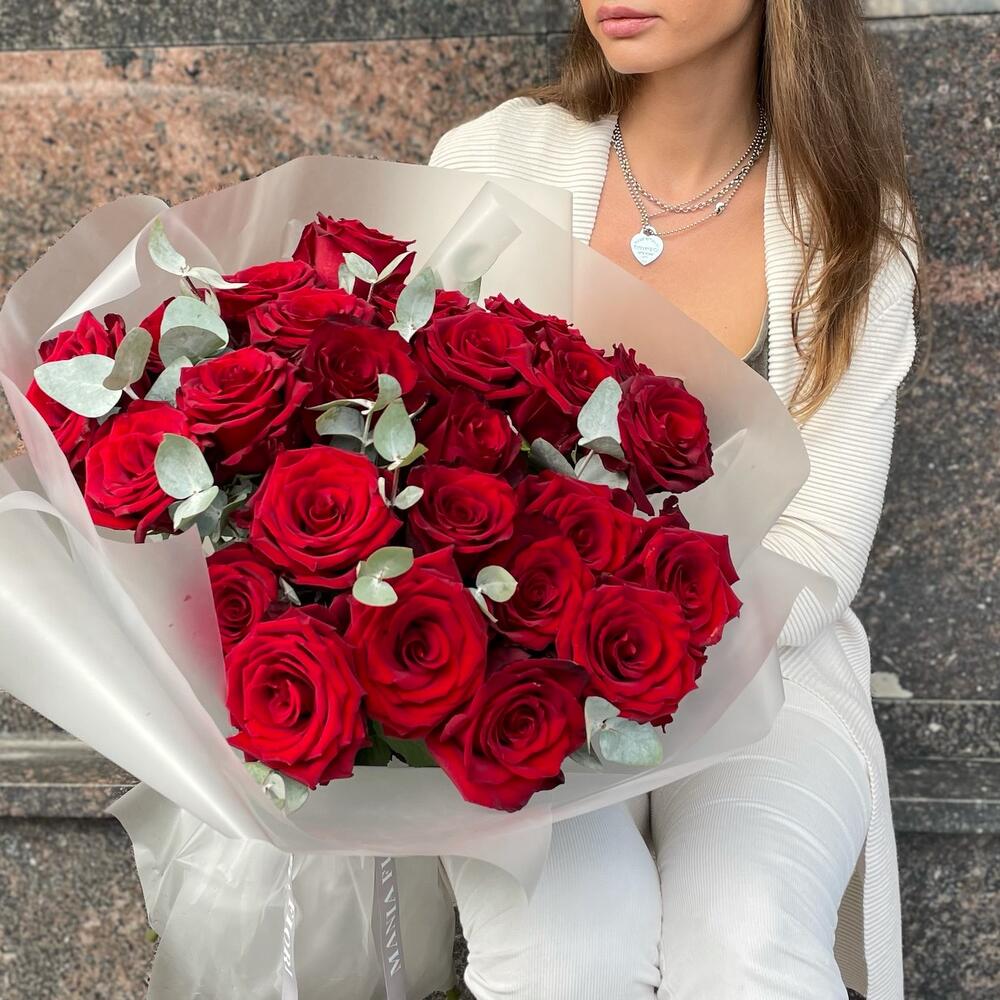 Букет из высоких красных роз с эвкалиптом