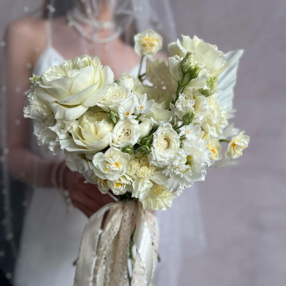 Лизиантус – 3 шт.Нарцисс – 9 шт.Диантус – 5 шт.Пионовидная роза – 5 шт.Атласная лента – 1 шт.Кустовая пионовидная роза – 5 шт.пальмовое копье – 1 шт.