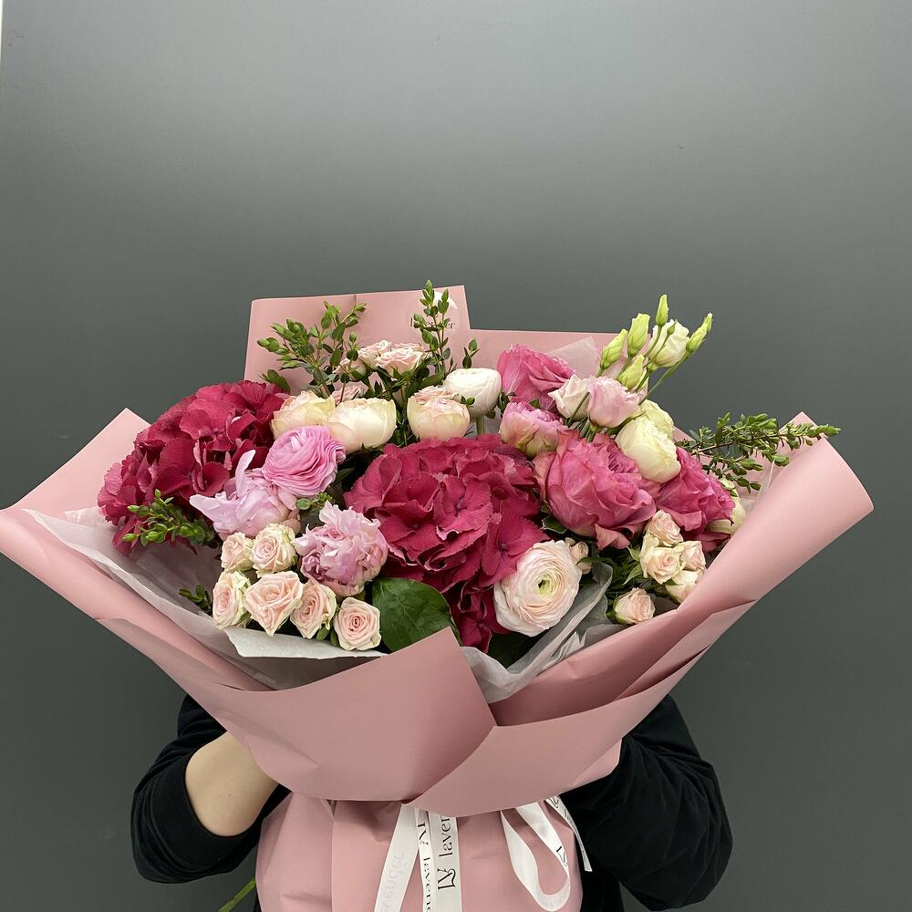 Альстромерии, Гвоздики, Кустовые розы, Лизиантусы, Розы, Хризантемы