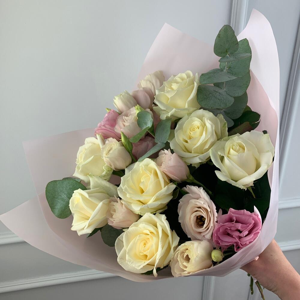 Лента – 1 шт.Лизиантус – 2 шт.Эвкалипт – 3 шт.Роза 50 см – 7 шт.Матовая пленка – 1 шт.