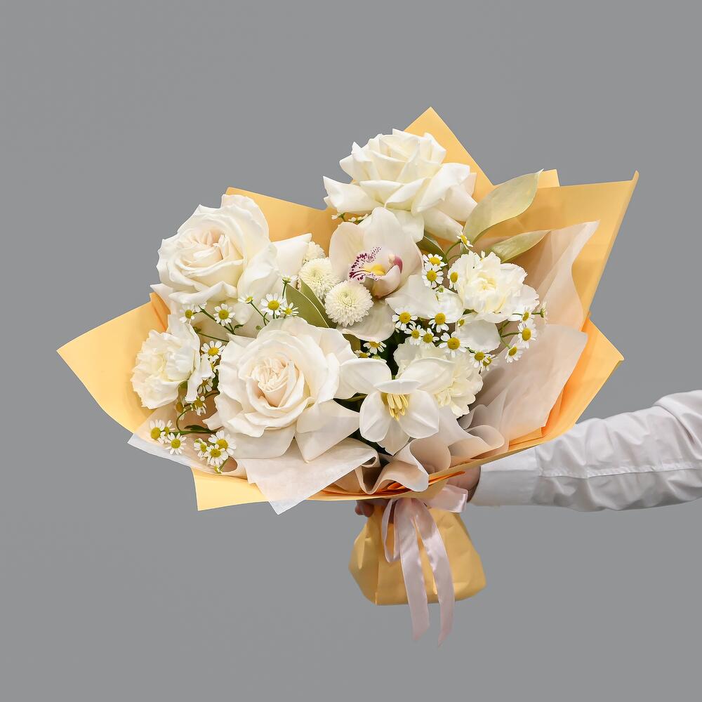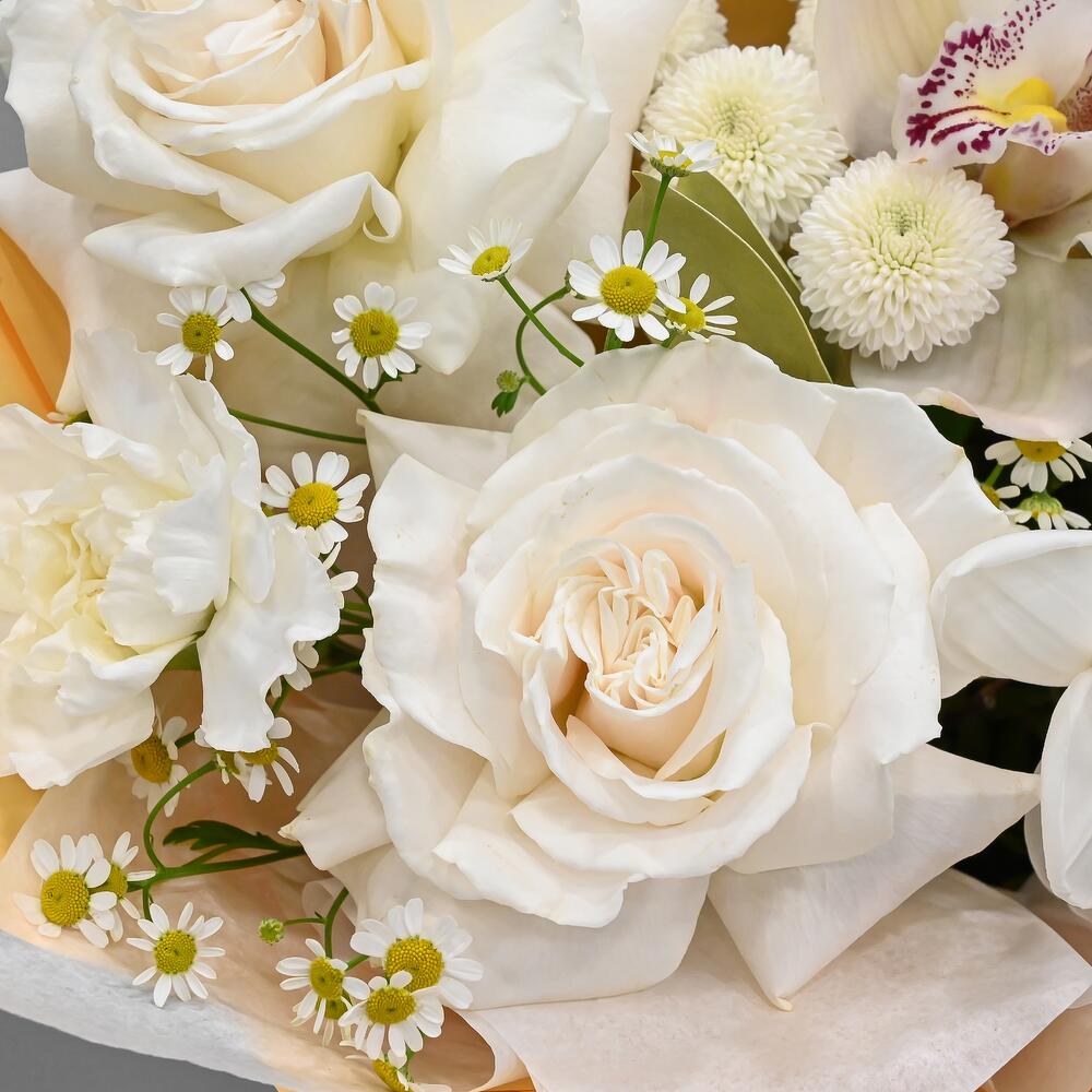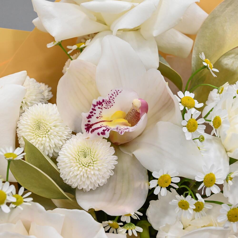 Орхидея Цимбидиум – 1 шт.Рускус – 2 шт.Тюльпан – 1 шт.Хризантема кустовая – 1 шт.Ромашка – 2 шт.Упаковка дизайнерская – 1 шт.Французская роза – 3 шт.
