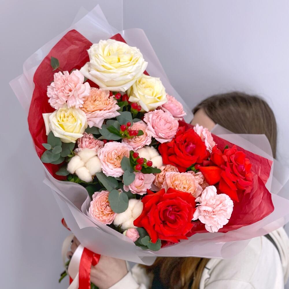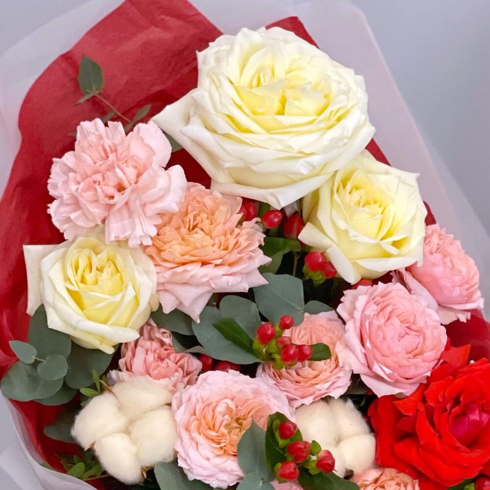 Французская роза – 3 шт.Роза Эквадор – 3 шт.Кустовая пионовидная роза – 4 шт.Хиперикум – 2 шт.Гвоздика – 3 шт.Хлопок – 3 шт.Фисташка – 2 шт.Эвкалипт – 2 шт.Упаковка дизайнерская – 1 шт.