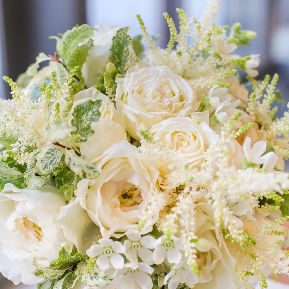 Питтоспорум – 3 шт.Лента атласная – 1 шт.Роза пионовидная – 13 шт.Астильба белая – 5 шт.оксипетамум белый – 5 шт.